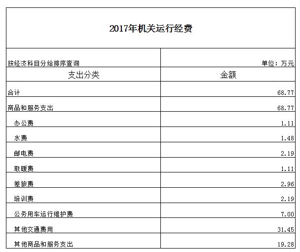 机关运行费共计68.77万元,包括办公费、水电费、公车运行费、差旅费、培训费等,均是按有关管理规定按人头提取的。