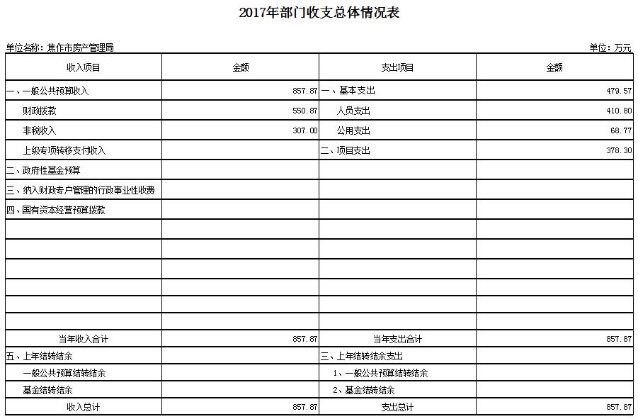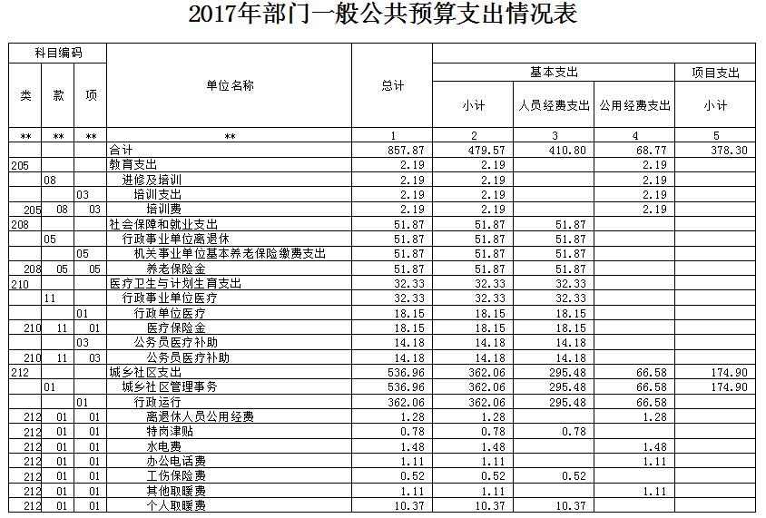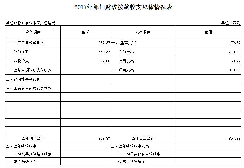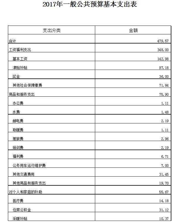 2017年预算收入857.87万元,2017年预算支出857.87万元,比2016年预算收入、支出增加326.77万元。收入部分财政拨款增加100.77万元,非税收入增加226万元;支出部分基本支出增加144.79万元,项目支出增加181.98万元。