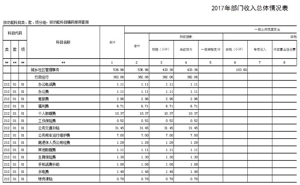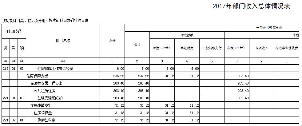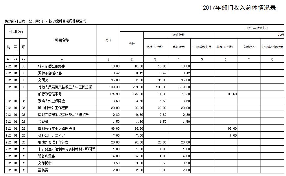 2017年政府采购金额为4万元,系设备购置费。 7、国有资本经营预算收支情况说明 2017年没有国有资本经营预算收支,所以为空表。 8、预算绩效管理情况报告 2017年项目支出为378.3万元,其中:100万元以上项目为公租房建设维护203.4万元,100万元以下项目合计为174.9万元,共计12个项目。按要求规范使用资金,最大程度发挥社会效益和经济效益。 二、预算表格