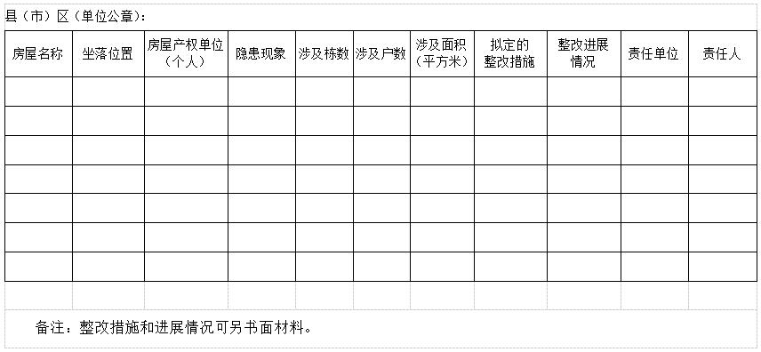 焦作市房产管理中心文件 焦房文〔2017〕88号 焦作市房产管理中心 关于进一步开展城市老旧建筑安全排查整 治工作的紧急通知 各县(市)区、城乡一体化示范区房管(住建)部门: 为进一步加强安全生产工作,严格落实安全生产责任制,贯彻落实全省住房城乡建设系统开展安全生产大检查通知(豫建〔2017〕148号)精神,为党的十九大胜利召开营造稳定的安全生产环境,为切实做好我市这项工作,经研究,现将有关事项通知如下: 一、要迅速抓好2016年排查出有房屋安全隐患的全面整治 (一)对目前正在隐患整改的38栋楼,要进一步加大力度、加快整治、明确专人负责,在九月底前要全面整改完毕。 (二)对房屋安全隐患整改要全面建立整改台账,登记分类,做到资料详实,数据准确。 (三)对房屋安全隐患整改过的要有专业技术部门进行隐患整改的技术鉴定,并出具报告。 二、要迅速全面做好老旧建筑安全的再排查 在做好房屋安全隐患整改的同时,要重新对其他老旧建筑进行一次再排查。 (一)结合2016年城市老旧建筑安全排查整治内容,对建筑年代较长、建设标准较失修失养严重的建筑进行现场查看,重点督察在使用过程中出现涉及结构安全问题或人民群众因质量问题多次投诉的房屋。 (二)建造年代较长,已超出或接近正常涉及使用年限扔继续使用的房屋及达到正常设计使用年限一半及以上的公共建筑(如体育馆、商场、学校校舍等)。 (三)擅自改变使用功能及私自拆改主题结构的房屋。 (四)临近易发生自然灾害(如河、山体、采空沉陷区等)的房屋。 (五)存在其他违法违规情况的房屋等。 三、要迅速开展全面督查工作 市局将在近日内要对此项工作进行专项督查,督查主要内容是: (一)是否制定了老旧建筑安全排查整治工作方案,并安排部署。 (二)是否全面掌握了老旧建筑的安全状况。 (三)是否对存在安全隐患的老旧建筑制定了安全整改措施并进行了整改。 (四)督查方式:听取汇报、查阅资料、现场查看。 四、落实责任、加强检查 从通知即日起到九月底为各县(市)区、城乡一体化示范区房管(住建)部门再排查再整改阶段。十月十五日前将这次排查整情况书面报送,十月下旬将对各部门进行督查。 老旧建筑安全再排查再整治工作是当前全省住房城乡建设系统一项重要工作。各县市房管(住建)部门要高度重视,精心组织,突出重点,落实责任,确保实效,对发现的安全隐患要督促当地主管部门跟踪到底,坚决整改到位。对存在责任不落实或落实不到位等问题的单位和个人,依法依规严肃处理,对不履行或不正确履行职责的市(县)主管部门通报批评,严重的提请当地政府或纪检部门进行问责,强化责任追究。 联系人:赵伟 电话:0391-2925675 邮箱:jzfgjzzk@163.com 附件:2016年老旧建筑安全隐患排查整改工作台账 焦作市房产管理中心 2017年9月21日 附件 2016-2017年老旧建筑安全隐患排查整治工作台账 焦作市房产管理中心办公室 2017年9月22日印发