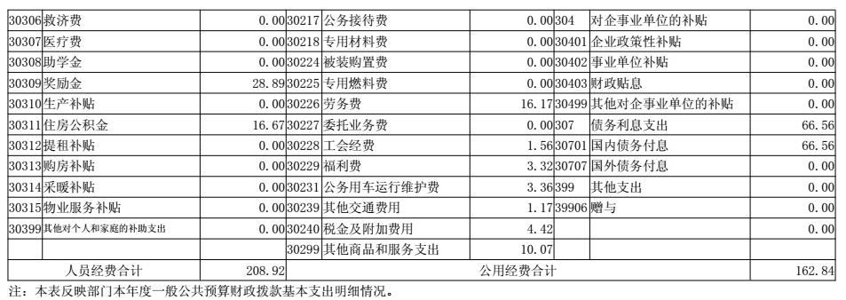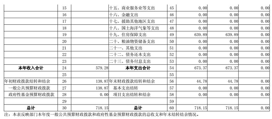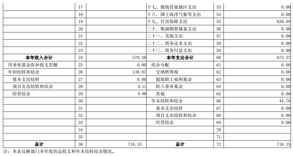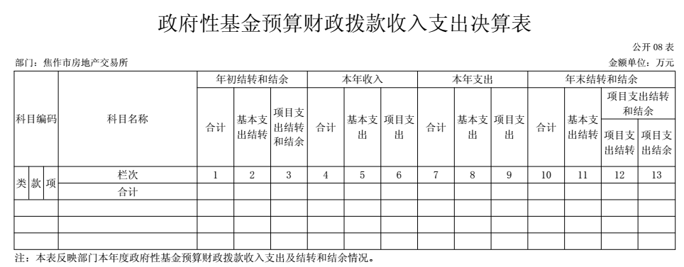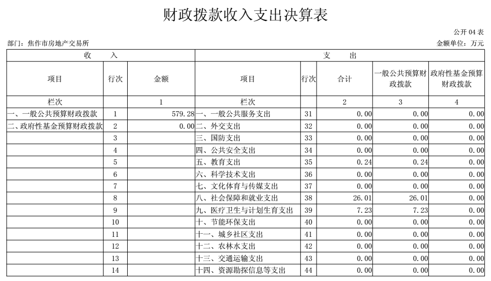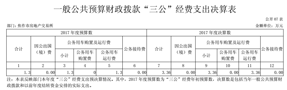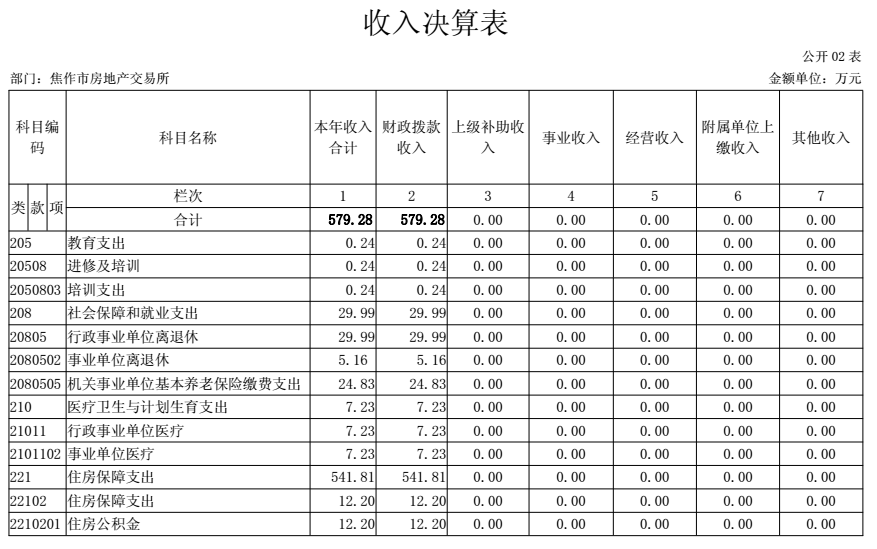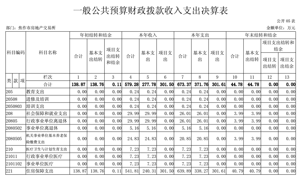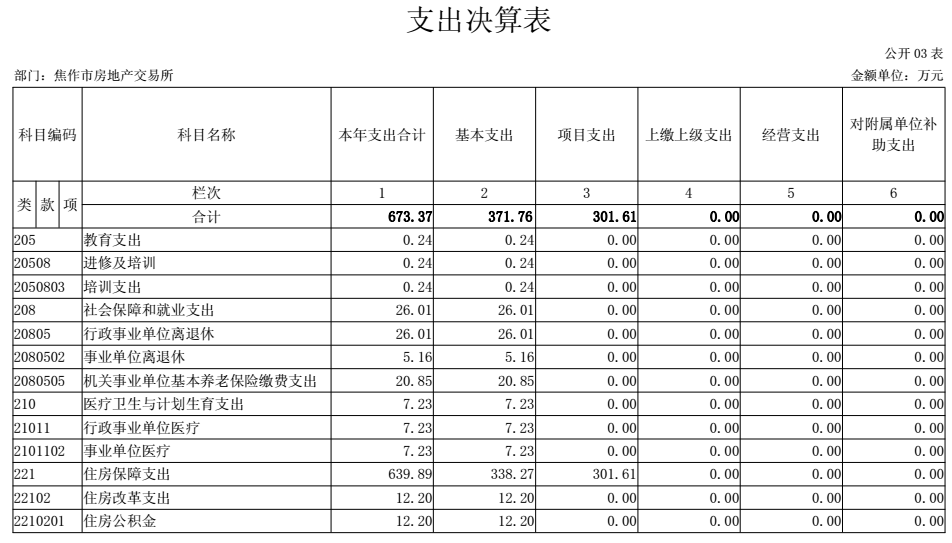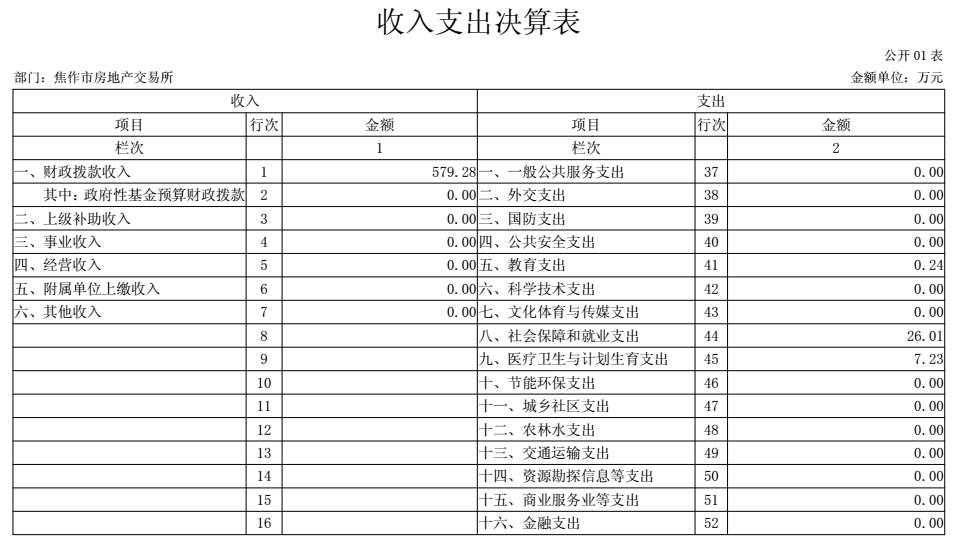 焦作市房地产交易所 2017年度部门决算 二〇一八年九月 目 录 第一部分 焦作市房地产交易所概况 一、部门职责 二、机构设置 第二部分 2017年度部门决算表 一、收入支出决算总表 二、收入决算表 三、支出决算表 四、财政拨款收入支出决算总表 五、一般公共预算财政拨款支出决算表 六、一般公共预算财政拨款基本支出决算表 七、一般公共预算财政拨款“三公”经费支出决算表 八、政府性基金预算财政拨款收入支出决算表 第三部分 2017年度部门决算情况说明 一、收入支出决算总体情况说明 二、关于收入决算情况说明 三、支出决算情况说明 四、财政拨款收入支出决算总体情况说明 五、一般公共预算财政拨款支出决算情况说明 六、一般公共预算财政拨款基本支出决算情况说明 七、一般公共预算财政拨款“三公”经费支出决算情况说明 八、预算绩效情况说明 九、政府性基金预算财政拨款支出决算情况说明 十、机关运行经费支出情况说明 十一、政府采购支出情况说明 十二、国有资产占用情况说明 第四部分 名词解释 第一部分 焦作市房地产交易所概况 一、部门职责 焦作市房地产交易所成立于1983年,单位性质是自收自支事业单位,执行《行政事业单位会计制度》。其主要职责:接受委托审查商品房预(销)售许可手续;办理房地产转让、抵押、租赁、交换、赠与等交易活动的登记、签证及权属转移手续;审核房屋交易成交价格,规范市区房产中介服务; 发布各类房产价格信息。 二、机构设置 截至2017年12月31日,独立编制机构1个(事业1个),占100%。编制人数22人,年末实有人数22人,离退休人员7人,其他人员45人。 所内部设办公室(含财务科)、交易科、档案租赁科、合同备案科、资金监管科、绩效监察科。 第二部分 2017年度部门决算表 第三部分 2017年度部门决算情况说明 一、收入支出决算总体情况说明 2017年度收、支总计均为718.15万元。与2016年度相比,收、支总计各增加718.15万元,增长0.00%。主要原因是2017年是我单位第一年参加决算,故无2016年决算数据,无法相比。 二、收入决算情况说明 2017年度收入合计579.28万元,其中:财政拨款收入579.28万元,占100%;上级补助收入0.00万元,占0.00%;事业收入0.00万元,占0.00%;经营收入0.00万元,占0.00%;附属单位上缴收入0.00万元,占0.00%;其他收入0.00万元,占0.00%。 三、支出决算情况说明 2017年度支出合计673.37万元,其中:基本支出371.76万元,占55.21%;项目支出301.61万元,占44.79%;上缴上级支出0.00万元,占0.00%;经营支出0.00万元,占0.00%;对附属单位补助支出0.00万元,占0.00%。 四、财政拨款收入支出决算总体情况说明 2017年度财政拨款收、支总计均为718.15万元。与2016年度相比,财政拨款收、支总计各增加718.15万元,增长0.00%。主要原因是:2017年我单位第一次参加决算,无2016年决算数据,无法相比。 五、一般公共预算财政拨款支出决算情况说明 (一)总体情况。 2017年度一般公共预算财政拨款支出673.37万元,占支出合计的100%。与2016年度相比,一般公共预算财政拨款支出增加673.37万元,增长0.00%。主要原因是2017年我单位第一次参加决算,无2016年决算数据,无法相比。 (二)结构情况。 2017年度一般公共预算财政拨款支出673.37万元,主要用于以下方面:一般公共服务(类)支出0.00万元,占0.00%;外交类支出0.00万元,占0.00%;国防(类)支出0.00万元,占0.00%; 教育(类)支出 0.24万元,占0.04%;科学技术(类)支出 0.00万元,占0.00%;文化体育与传媒(类)支出 0.00万元,占0.00%;社会保障和就业(类)支出 26.01万元,占3.86%;医疗卫生和计划生育(类)支出 7.23万元,占1.07%;节能环保(类)支出 0.00万元,占0.00%;城乡社区(类)支出 0.00万元,占0.00%;农林水(类)支出 0.00万元,占0.00%;交通运输(类)支出 0.00万元,占0.00%;资源勘探信息(类)支出 0.00万元,占0.00%;商业服务业(类)支出 0.00万元,占0.00%;金融(类)支出 0.00万元,占0.00%;援助其他地区(类)支出 0.00万元,占0.00%;国土海洋气象(类)支出 0.00万元,占0.00%;住房保障(类)支出 639.89万元,占95.03%;粮油物资储备(类)支出 0.00万元,占0.00%;其他(类)支出 0.00万元,占0.00%;债务还本(类)支出 0.00万元,占0.00%;债务付息(类)支出 0.00万元,占0.00%。 (三)具体情况。 2017年度一般公共预算财政拨款支出年初预算为579.28万元,支出决算为673.37万元,完成年初预算的116.24%。决算数与年初预算数存在差异的主要原因:2016年结转资金弥补2017年支出不足。其中: 1.一般公共服务(类)财政事务(款)行政运行(项)。年初预算为0.00万元,支出决算为0.00万元,完成年初预算的0.00%。 2.一般公共服务(类)财政事务(款)一般行政管理事务(项)。年初预算为0.00万元,支出决算为0.00万元,完成年初预算的0.00%。 六、一般公共预算财政拨款基本支出决算情况说明 2017年度一般公共预算财政拨款基本支出371.76万元。与2016年度相比,增加371.76万元,增长0.00%,主要原因:2017年单位第一次参加决算,无2016年决算数据,无法相比。其中:人员经费208.92万元,主要包括:基本工资、津贴补贴、伙食补助费、绩效工资、机关事业单位基本养老保险缴费、职业年金缴费、其他社会保障缴费、其他工资福利支出、离休费、退休费、抚恤金、生活补助、医疗费、奖励金、住房公积金、采暖补贴、物业服务补贴、其他对个人和家庭的补助支出……;公用经费162.84万元,主要包括:办公费、印刷费、咨询费、手续费、水费、电费、邮电费、取暖