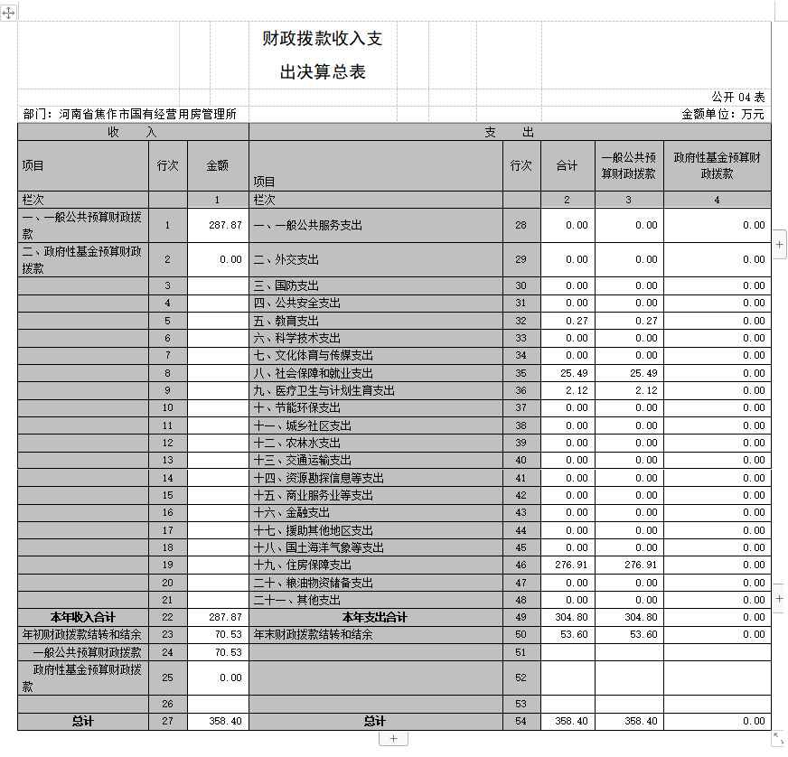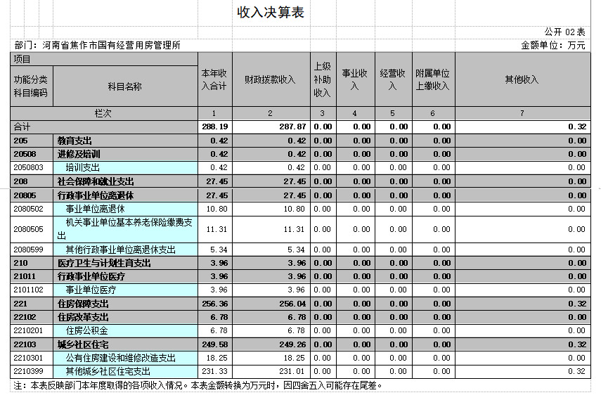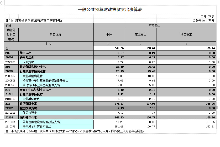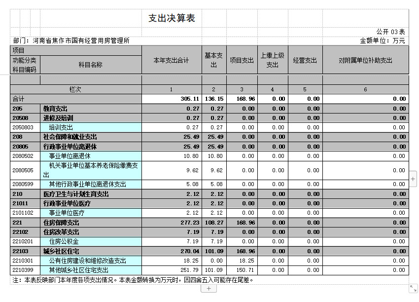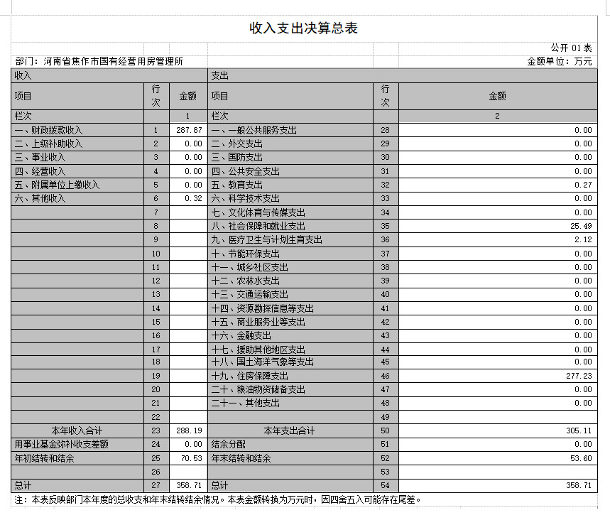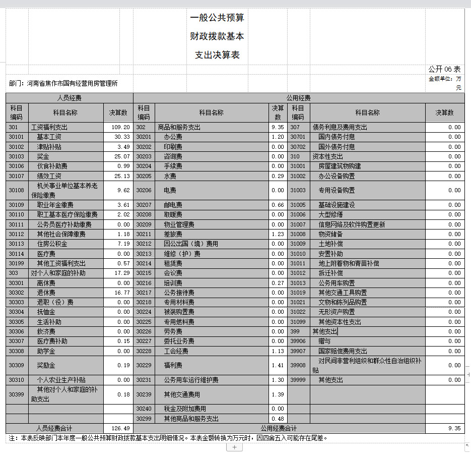 2018年度 焦作市国有经营用房管理所部门决算 二〇一九年九月 目 录 第一部分 焦作市国有经营用房管理所概况 一、部门职责 二、机构设置 第二部分 2018年度部门决算表 一、收入支出决算总表 二、收入决算表 三、支出决算表 四、财政拨款收入支出决算总表 五、一般公共预算财政拨款支出决算表 六、一般公共预算财政拨款基本支出决算表 七、一般公共预算财政拨款“三公”经费支出决算表 八、政府性基金预算财政拨款收入支出决算表 第三部分 2018年度部门决算情况说明 一、收入支出决算总体情况说明 二、收入决算情况说明 三、支出决算情况说明 四、财政拨款收入支出决算总体情况说明 五、一般公共预算财政拨款支出决算情况说明 六、一般公共预算财政拨款基本支出决算情况说明 七、一般公共预算财政拨款“三公”经费支出决算情况说明 八、预算绩效情况说明 九、政府性基金预算财政拨款支出决算情况说明 十、机关运行经费支出情况说明 十一、政府采购支出情况说明 十二、国有资产占用情况说明 第四部分 名词解释 第一部 焦作市国有经营用房管理所概况 一、部门职责 1、主要负责国有直管房屋的管理、租赁和维护工作。 2、管理方式:经营性用房租金实行对原用户协议递增续签合同,收回的空闲房屋以公开竞租形式租赁。住宅用房租金按照焦发改服务[545]号《关于焦作市直管公房和廉租各楼层租金标准的批复》执行。 二、机构设置情况 焦作市国有经营用房管理所成立于1986年12月,隶属于焦作市房产管理中心,自收自支事业单位,正科级建制,编制数9人,实有人数8人,另有外聘人员6名。所内部设办公室(含财务科)、房产科、维修科。 从决算单位构成看,焦作市国有经营用房管理所部门决算包括本级决算。 第二部分 2018年度部门决算表 第三部分 2018年度部门决算情况说明 一、收入支出决算总体情况说明 2018 年度收、支总计均为358.71万元。与上年度相比,收、支总计各增加38.55万元,增长12.04%。主要原因是人员工资调整和四城联创局前楼粉刷维修。 二、收入决算情况说明 2018 年度收入合计288.19万元,其中:财政拨款收入287.87万元,占 99.89%;上级补助收入0.00万 元,占0.00%;事业收入0.00 万元,占0.00%;经营收入0.00万元,占0.00%;附属单位上缴收入 0.00万元,占0.00%;其他收 入0.32万元,占0.11%。 三、支出决算情况说明 2018 年度支出合计305.11万元,其中:基本支出136.15万元,占 44.62%;项目支出168.96万 元,占55.38%;上缴上级支出0.00万元,占0.00%;经营支出 0.00万元,占0.00%;对 附属单位补助支出0.00万元,占0.00%。 四、财政拨款收入支出决算总体情况说明 2018 年度财政拨款收、支总计均为358.40万元。与上年度相比,财政拨款收、支总计各增加38.61万元,增长12.07%。主要原因调整工资和局前楼粉刷维修。 五、一般公共预算财政拨款支出决算情况说明 (一)总体情况。 2018 年度一般公共预算财政拨款支出304.80万元,占本年支出合计的99.90%。与上年度相比,一般公共预算财政拨款支出增加57.62万元,增长23.31%。主要原因是人员工资调整。 (二)结构情况。 2018年度一般公共预算财政拨款支出304.80万元,主要用于以下方面:社会保障和就业支出25.49万元,占比8.36%;医疗卫生与计划生育支出2.12万元,占比0.7%;住房保障支出276.92万元,占比90.85%。 (三)具体情况。 2018 年度一般公共预算财政拨款支出年初预算为287.87万元,支出决算为304.80万元,完成年初预算的105.88%。其中: 1.社会保障和就业支出(类)行政事业单位离退休(款)机关事业单位基本养老保险缴费支出(项)。年初预算为27.45万元,支出决算为25.49万元,完成年初预算的92.86%。决算数与年初预算数存在差异的主要原因是退休人员去世。 2.住房保障支出(类)城乡社区住宅(款)其他城乡社区住宅支出(项)。年初预算为256.17万元,支出决算为276.92万元,完成年初预算的108.10%。决算数与年初预算数存在差异的主要原因是四城联创局前楼粉刷维修。 六、一般公共预算财政拨款基本支出决算情况说明 2018 年度一般公共预算财政拨款基本支出135.84万元。与上年度相比,增加16.24万元,增长13.58%,主要原因是人员增加。其中:人员经费126.49万 元,主要包括:基本工资、津贴补贴、伙食补助费、绩效工资、机关事业单位基本养老保险缴费、职业年金缴费、其他社会保障缴费、其他工资福利支出、离休费、 退休费、抚恤金、生活补助、医疗费、奖励金、住房公积金、采暖补贴、物业服务补贴、其他对个人和家庭的补助支出;公用经费 9.35万元,主要包括:办公费、印刷费、咨询费、手续费、水费、电费、邮电费、取暖费、物业管理费、差旅费、因公 出国(境)费用、维修(护)费、租赁费、会议费、培训费、公务接待费、专用材料费、劳务费、委托业务费、工会经费、福利费、公务用车运行维护费、其他交通 费用、税金及附加费用、其他商品和服务支出、办公设备购置、专用设备购置、信息网络及软件购置更新、其他资本性支出。 七、一般公共预算财政拨款“三公”经费支出决算情况说明 (一)“三公”经费财政拨款支出决算总体情况说明。 2018 年度“三公”经费财政拨款支出预算为3.30万元,支出决算为3.19万元,完成预算 的96.56%。2018年度“三公”经费支出决算数与预算数存在差异的主要原因是精减开支。 (二)“三公”经费财政拨款支出决算具