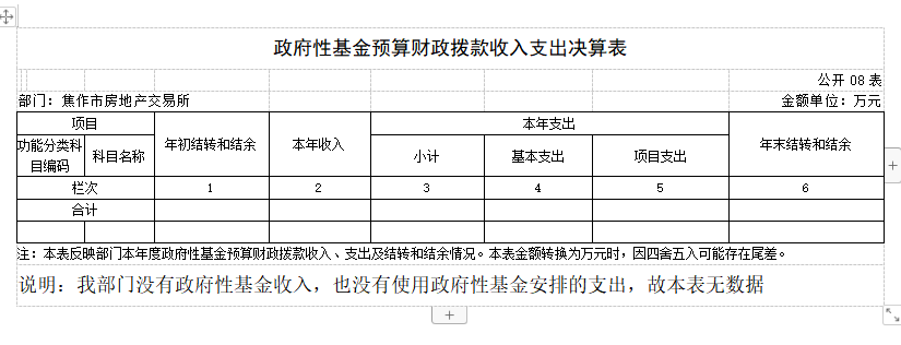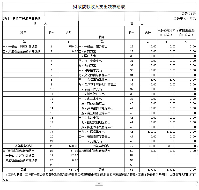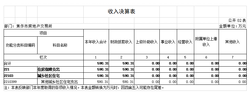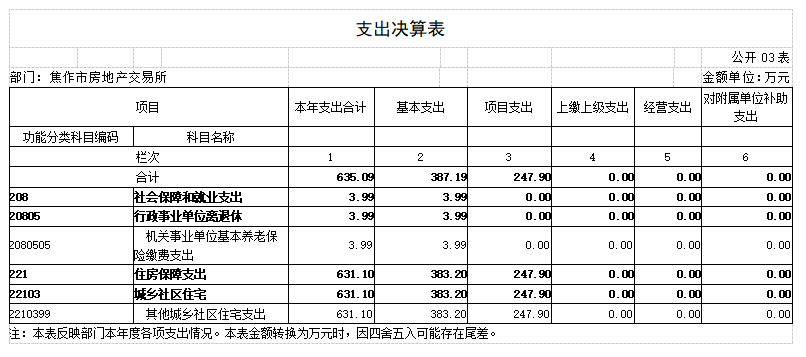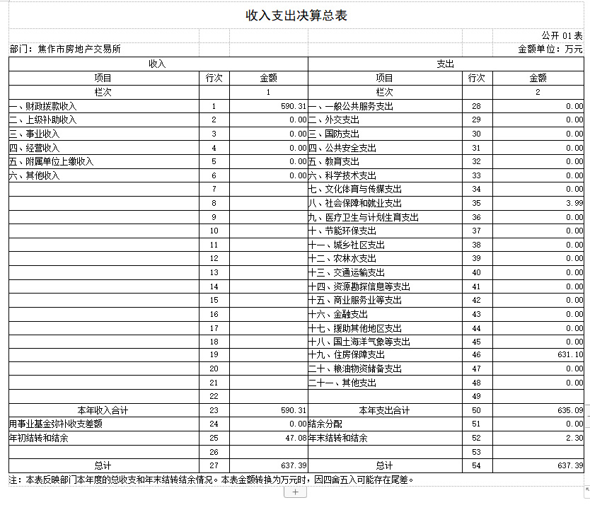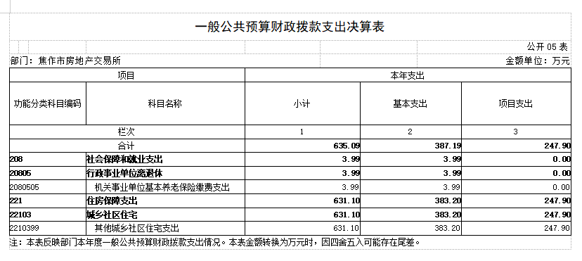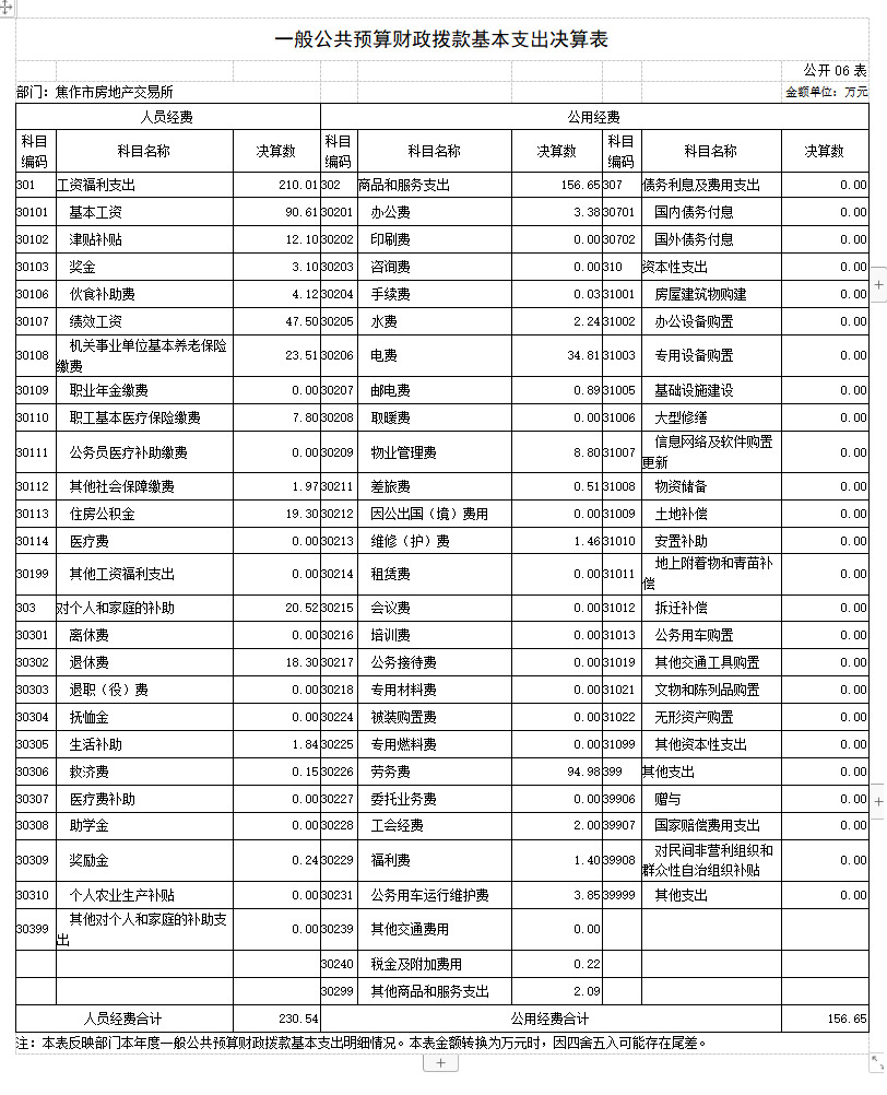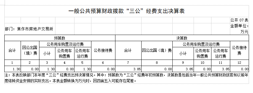 2018年度 焦作市房地产交易所部门决算 二〇一九年九月 目 录 第一部分 焦作市房地产交易所概况 一、部门职责 二、机构设置 第二部分 2018年度部门决算表 一、收入支出决算总表 二、收入决算表 三、支出决算表 四、财政拨款收入支出决算总表 五、一般公共预算财政拨款支出决算表 六、一般公共预算财政拨款基本支出决算表 七、一般公共预算财政拨款“三公”经费支出决算表 八、政府性基金预算财政拨款收入支出决算表 第三部分 2018年度部门决算情况说明 一、收入支出决算总体情况说明 二、收入决算情况说明 三、支出决算情况说明 四、财政拨款收入支出决算总体情况说明 五、一般公共预算财政拨款支出决算情况说明 六、一般公共预算财政拨款基本支出决算情况说明 七、一般公共预算财政拨款“三公”经费支出决算情况说明 八、预算绩效情况说明 九、政府性基金预算财政拨款支出决算情况说明 十、机关运行经费支出情况说明 十一、政府采购支出情况说明 十二、国有资产占用情况说明 第四部分 名词解释 第一部分 焦作市房地产交易所概况 一、部门职责 焦作市房地产交易所成立于1983年,单位性质是自收自支事业单位,执行《行政事业单位会计制度》。其主要职责:接受委托审查商品房预(销)售许可手续;办理房地产转让、抵押、租赁、交换、赠与等交易活动的登记、签证及权属转移手续;审核房屋交易成交价格,规范市区房产中介服务; 发布各类房产价格信息。 二、机构设置 焦作市房地产交易所是独立事业编制机构,编制人数22人,年末实有人数21人,离退休人员8人,其他人员45人。 所内部设办公室(含财务科)、交易科、档案租赁科、合同备案科、资金监管科、绩效监察科。 从决算单位构成看,焦作市房地产交易所部门决算包括本级决算。 第二部分 2018年度部门决算表 第三部分 2018年度部门决算情况说明 一、收入支出决算总体情况说明 2018 年度收、支总计均为637.39万元。与上年度相比,收、支总计各减少80.76万元,下降11.25%。主要原因是我单位无收入来源,各项经费支出精简。 二、收入决算情况说明 2018 年度收入合计590.31万元,其中:财政拨款收入590.31万元,占 100.00%。 三、支出决算情况说明 2018 年度支出合计635.09万元,其中:基本支出387.19万元,占 60.97%;项目支出247.90万 元,占39.03%。 四、财政拨款收入支出决算总体情况说明 2018 年度财政拨款收、支总计均为637.39万元。与上年度相比,财政拨款收、支总计各减少80.76万元,增长下 降11.25%。主要原因是我单位无收入来源,各项经费支出精简。 五、一般公共预算财政拨款支出决算情况说明 (一)总体情况。 2018 年度一般公共预算财政拨款支出635.09万元,占本年支出合计的100.00%。与上年度相比,一般公共预算财政拨款支出减少38.28万元,下降5.68%。主要原因是我单位根据国家政策规定,取消收费项目,无收入来源,各项经费支出精简。 (二)结构情况。 2018年度一般公共预算财政拨款支出635.09万元,主要用于以下方面:社会保障和就业(类)支出3.99万元,占0.63%;住房保障(类)支出631.10万元,占99.37%。 (三)具体情况。 2018 年度一般公共预算财政拨款支出年初预算为635.09万元,支出决算为635.09万元,完成年初预算的100.00%。其中: 1.社会保障和就业支出(类)行政事业单位离退休(款)机关事业单位基本养老保险缴费支出(项)。年初预算为 0万元,支出决算为3.99万元,完成年初预算的399%。决算数与年初预算数存在差异的主要原因是:支出决算3.99万元是2017年度此功能分类的结转结余,2018年度列支。 2.住房保障支出(类)城乡社区住宅(款)其他城乡社区住宅支出(项)。年初预算为380万元,支出决算为631.10万元,完成年初预算的166.08%。决算数与年初预算数存在差异的主要原因是:我单位根据国家政策调整,取消收费项目,年初预算380万元是我单位职工基本工资和部分经费预算,经我单位向相关部门申请,获得财政补助拨款后,支出决算为631.10万元,故年初预算与决算存在差异。 六、一般公共预算财政拨款基本支出决算情况说明 2018年度一般公共预算财政拨款基本支出387.19万元。与上年度相比,增加15.43万元,增长4.15%,主要原因:人员工资、社保及住房公积金调整。其中:人员经费230.54万元,主要包括:基本工资、津贴补贴、奖金、伙食补助费、绩效工资、机关事业单位基本养老保险缴费、职工基本医疗保险缴费、其他社会保障缴费、住房公积金、退休费、生活补助、救济费、奖励金;公用经费156.65万元,主要包括:办公费、手续费、水费、电费、邮电费、物业管理费、差旅费、维修(护)费、劳务费、工会经费、福利费、公务用车运行维护费、税金及附加费用、其他商品和服务支出。 七、一般公共预算财政拨款“三公”经费支出决算情况说明 (一)“三公”经费财政拨款支出决算总体情况说明。 2018年度“三公”经费财政拨款支出预算为1.3万元,支出决算为3.85万元,完成预算的296.46%。2018年度“三公”经费支出决算数与预算数存在差异的主要原因是:1、我单位公务用车运行费预算1.3万元是一辆车的预算数,而单位实有车辆4台;2、我单位车辆严重老化,无法保障正常作业,故本年进行了车辆大修。 (二)“三公”经费财政拨款支出决算具体情况说明。 2018年度“三公”经费财政拨款支出决算中,公务用车购置及运行费支出决算3.85万