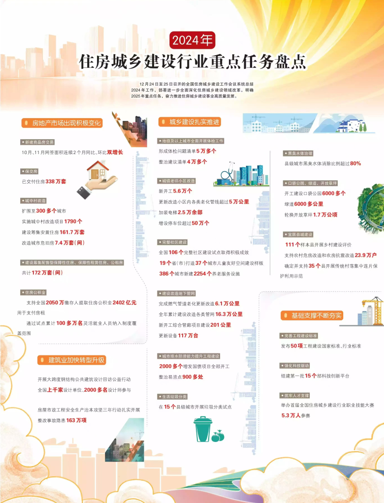 12月24日至25日召开的全国住房城乡建设工作会议系统总结2024年工作,部署进一步全面深化住房城乡建设领域改革,明确2025年重点任务,奋力推进住房城乡建设事业高质量发展。